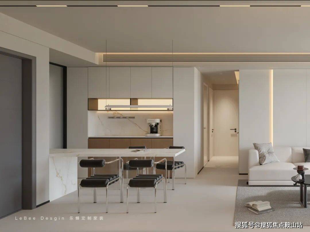 岩板岛台餐桌、简约吊灯提升质感,餐边柜嵌入咖啡机打造咖啡角,灯光上吊柜灯带与主灯配合,营造出通透、温馨且实用的舒适用餐与社交氛围。