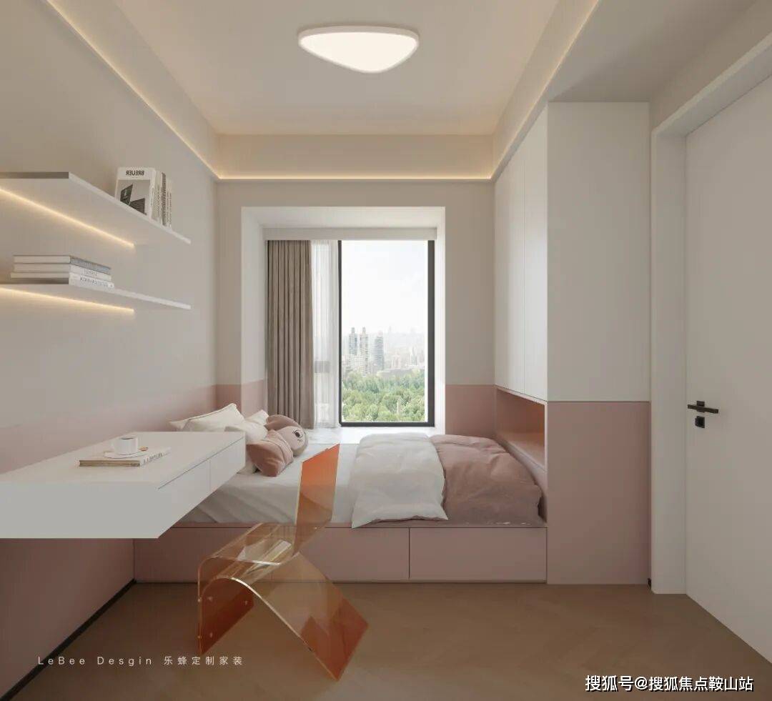 采用榻榻米+书桌一体化设计,巧妙整合睡眠、收纳(床下抽屉)与学习功能,上方开放架辅助置物,极致利用小空间。