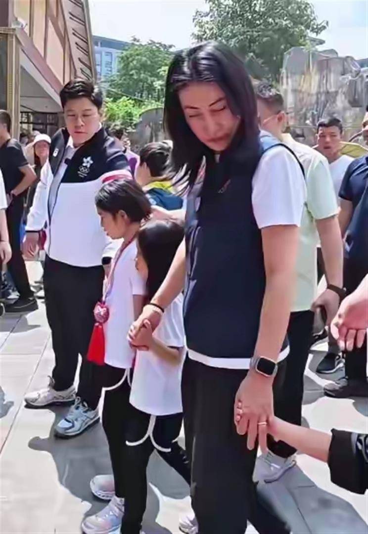 网友拍到的照片里,郭晶晶穿件咖啡色中式皮衣,戴顶粉色棒球帽,素着脸,皮肤好得发光,就站那儿听孩子叽叽喳喳讲新手机功能,一点不耐烦都没有。小女儿趴在手机店柜台前,厚厚的眼镜片都快贴上玻璃了,那场景跟带自家娃出门没啥两样。